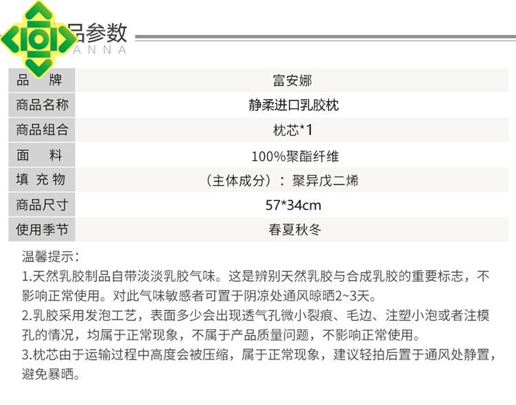 商品名称:富安娜 静柔进口乳胶枕 57*34cm 静柔进口乳胶枕 白色 白色(单位:个)