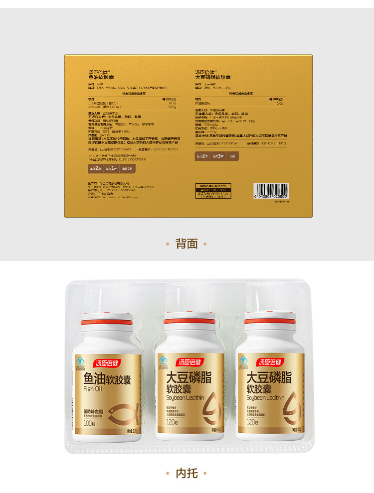 商品名称:汤臣倍健大豆磷脂软胶囊+鱼油软胶囊【磷脂120粒×2+鱼油100粒】