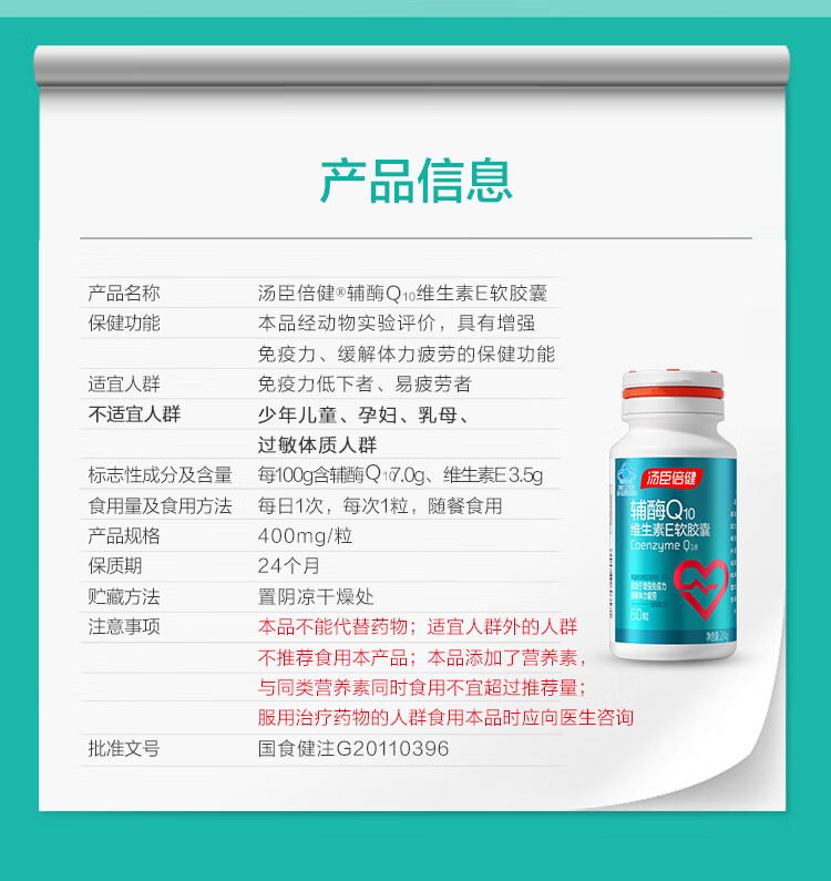 商品名称:汤臣倍健辅酶Q10维生素E软胶囊彩盒装(400mg*60粒)