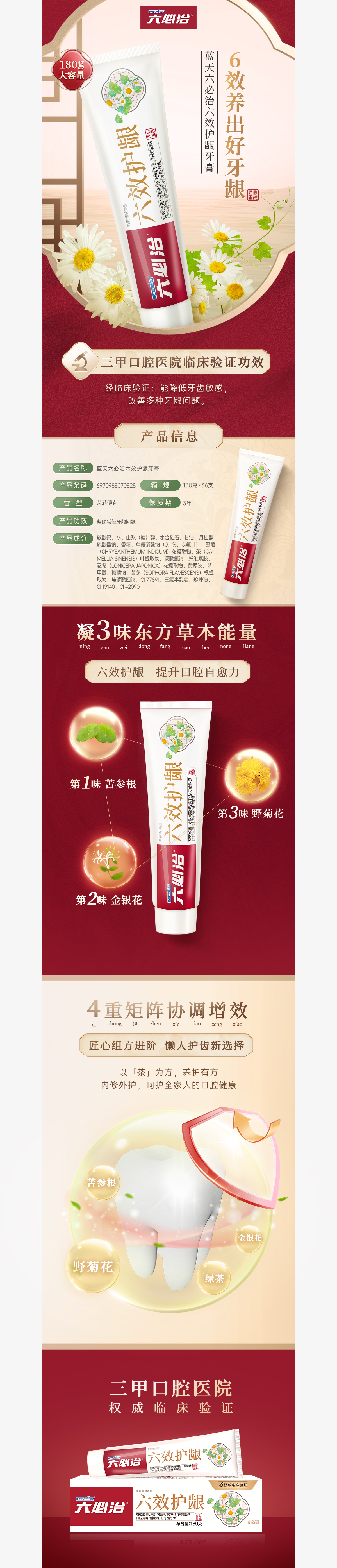 商品名称:六必治六效护龈牙膏(茉莉薄荷)180g*2支